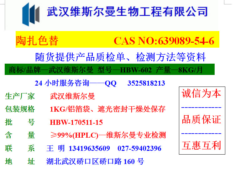 | HBW-602 | 維斯?fàn)柭?/th> | 99% | 1KG/鋁箔袋 | 需詢盤 | 3天 |