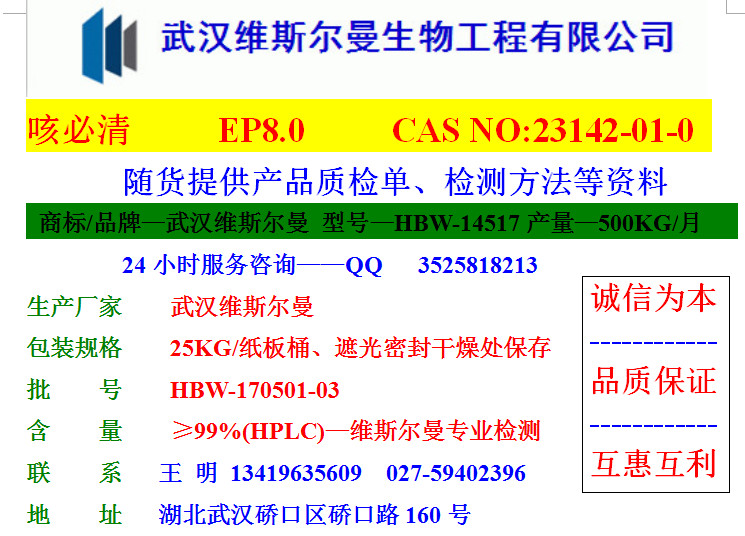 | HBW-2192 | 維斯?fàn)柭?/th> | 99% | 25KG/紙板桶 | 需詢盤 | 3天 |