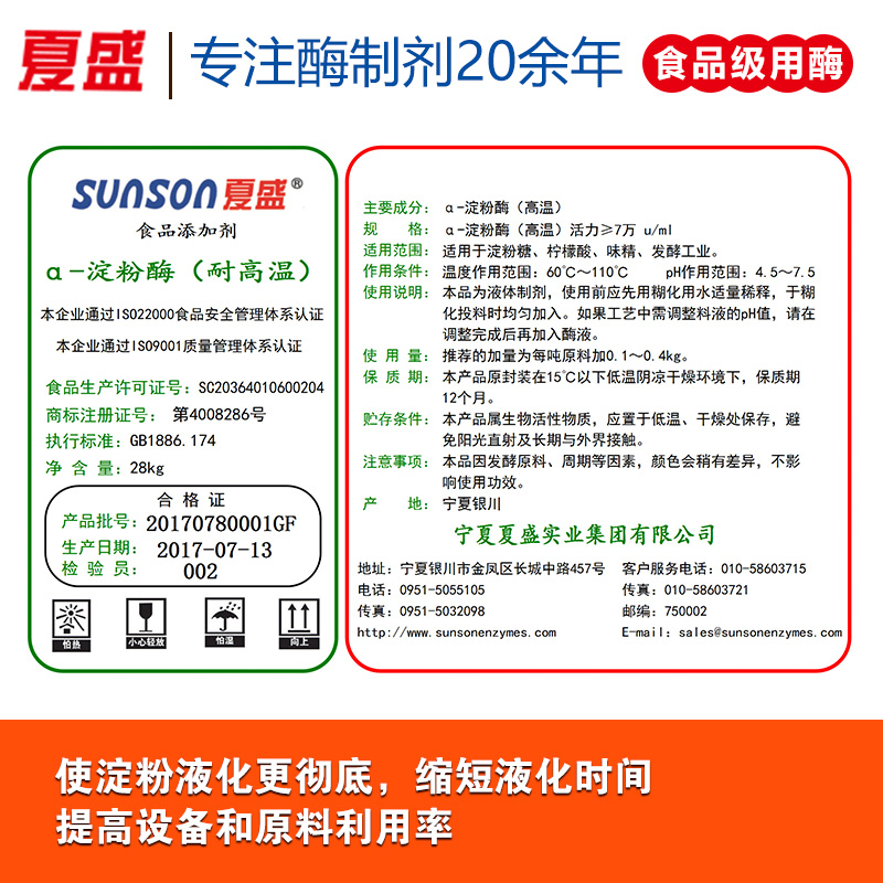 | 01 | 夏盛 | 酶活力≥18萬單位 | 25kg/桶 | ¥61.60元/公斤 | --- |