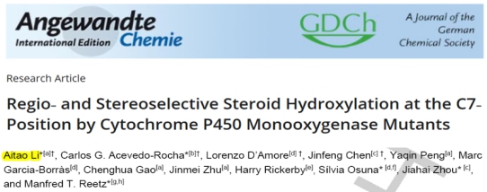 近日,湖北大學(xué)生命科學(xué)學(xué)院、省部共建生物催化與酶工程國(guó)家重點(diǎn)實(shí)驗(yàn)室李愛濤教授(第一及通訊作者),聯(lián)合德國(guó)馬普煤炭研究所Manfred T. Reetz教授、上海有機(jī)所周佳海研究員以及西班牙赫羅納大學(xué)Silvia Osuna教授,在Wiley出版社旗下的催化領(lǐng)域頂級(jí)期刊Angewandte Chemie International Edition(IF:12.257)發(fā)表題為“Regio- and Stereoselective Steroid Hydroxylation at the C7-Position by Cytochrome P450 Monooxygenase Mutants”(《細(xì)胞色素P450酶突變體催化的甾體C7β位區(qū)域和立體選擇性羥基化》)的研究性論文,其中湖北大學(xué)為第一通訊單位。