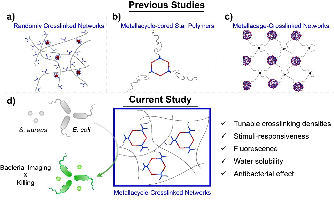 針對(duì)這一問題,西安交通大學(xué)材料學(xué)院張明明教授課題組在前期構(gòu)筑的熒光金屬大環(huán)的基礎(chǔ)上,提出一種利用熒光金屬大環(huán)交聯(lián)聚合物從而形成聚合物網(wǎng)絡(luò)的策略。這類超分子網(wǎng)絡(luò)很好地保持了金屬大環(huán)的熒光性能以及抗菌性,而且由于聚合物的引入,提高了其水溶性以及生物利用率,可以同時(shí)實(shí)現(xiàn)細(xì)菌的成像以及殺滅??蒲腥藛T詳細(xì)地研究了不同的交聯(lián)密度對(duì)于該類聚合物網(wǎng)絡(luò)的紫外吸收、熒光發(fā)射、溶劑化轉(zhuǎn)變溫度以及模量的影響,表明可以通過精確調(diào)控聚合物網(wǎng)絡(luò)的交聯(lián)密度來調(diào)節(jié)其功能以及應(yīng)用,這一研究不僅為拓?fù)浣Y(jié)構(gòu)交聯(lián)的聚合物網(wǎng)絡(luò)提供了一種方法,還開拓了這類聚合物網(wǎng)絡(luò)的生物應(yīng)用,促進(jìn)了拓?fù)浣Y(jié)構(gòu)交聯(lián)的聚合物網(wǎng)絡(luò)的發(fā)展。