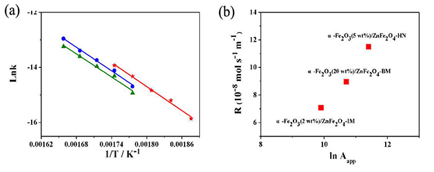 圖2. (a)催化劑在n-丁烯氧化脫氫上的Arrhenius圖:Fe2O3(5wt%)/ZnFe2O4-BM,藍色●;Fe2O3(2wt%)/ZnFe2O4-IM,綠色▲;Fe2O3(5wt%)/ZnFe2O4-HN,紅色★;