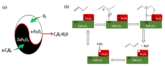 圖3. (a) α-Fe2O3/ZnFe2O4兩相催化劑上丁烯氧化脫氫的界面雙分子活化策略;(b)界面雙分子活化的反應路徑。