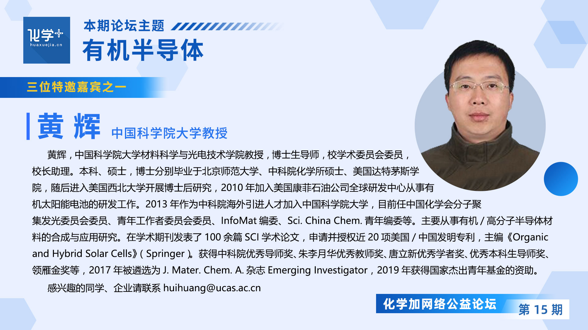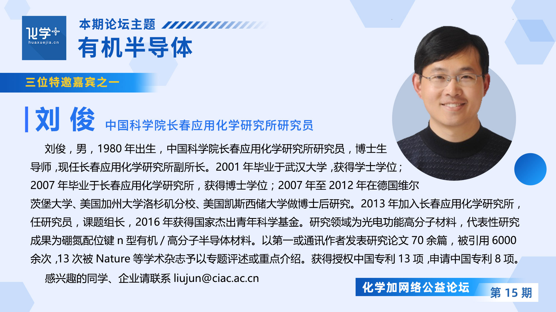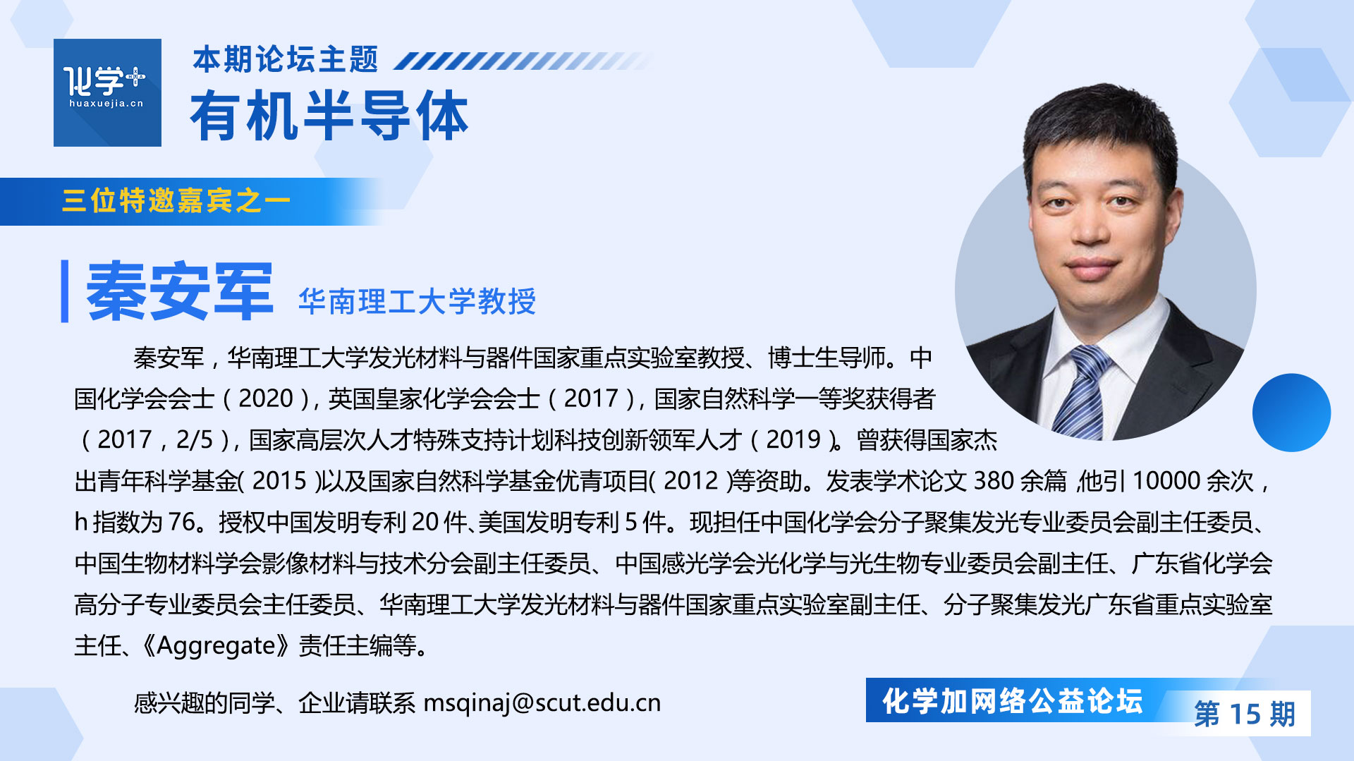 化學(xué)加網(wǎng)絡(luò)公益論壇第15期將于2022年9月3日(星期六)14:00-16:30舉行,我們很高興邀請到了華南理工大學(xué)秦安軍教授、中國科學(xué)院大學(xué)黃輝教授、中科院長春應(yīng)化所劉俊研究員等三位嘉賓做報告分享,...