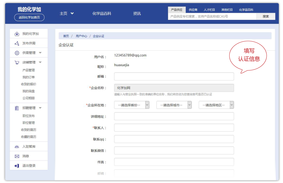 填寫完成后,點擊“提交認證”按鈕,化學加網(wǎng)工作人員會在1個工作日內(nèi)完成審核工作。
