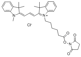 | 英文名 | 3H-Indolium, 2-[3-[1-[6-[(2,5-dioxo-1-pyrrolidinyl)oxy]-6-oxohexyl]-1,3-dihydro-3,3-dimethyl-2H-indol-2-ylidene]-1-propen-1-yl]-1,3,3-trimethyl-, chloride (1:1) | ||||