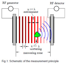 超聲波發(fā)生端(RF Generator)發(fā)出一定頻率和強(qiáng)度的超聲波,經(jīng)過(guò)測(cè)試區(qū)域,到達(dá)信號(hào)接收端(RF Detector)。當(dāng)顆粒通過(guò)測(cè)試區(qū)域時(shí),由于不同大小的顆粒對(duì)聲波的吸收程度不同,在接收端上得到的聲波的衰減程度也就不一樣,根據(jù)顆粒大小同超聲波強(qiáng)度衰減之間的關(guān)系,得到顆粒的粒度分布,同時(shí)還可測(cè)得體系的固含量。
