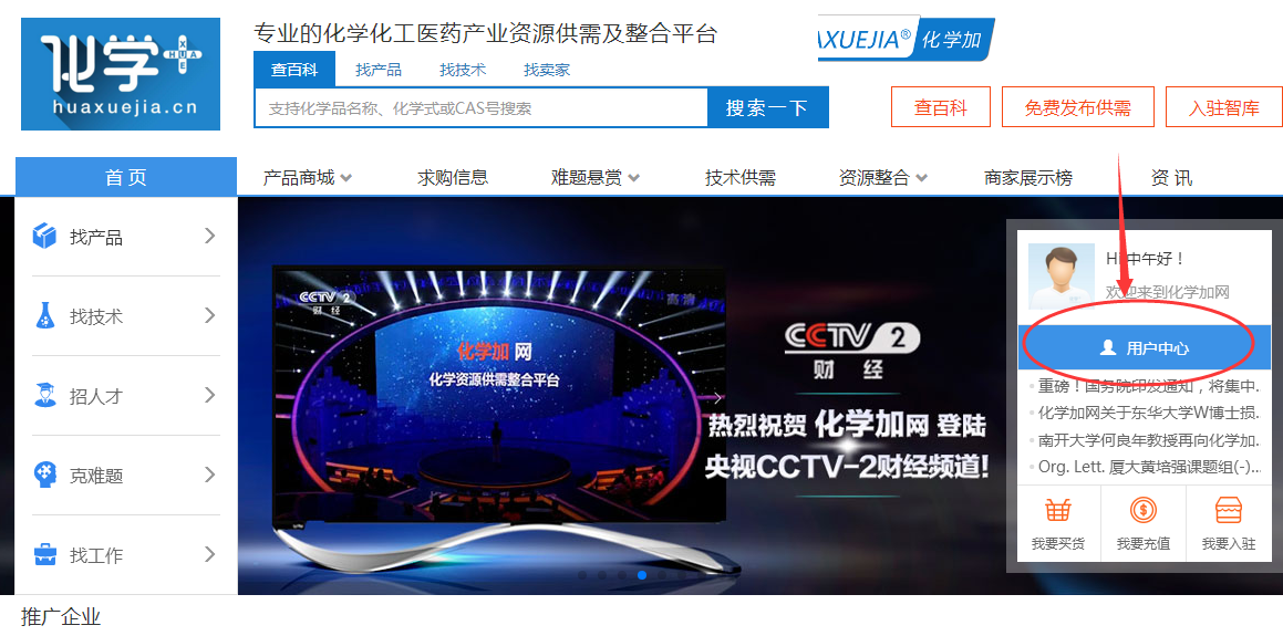 步驟三:設(shè)定好拳頭產(chǎn)品之后,返回化學(xué)加首頁。將鼠標(biāo)移動到“產(chǎn)品商城”上,會顯示下拉菜單,點擊“拳頭產(chǎn)品”進(jìn)入。