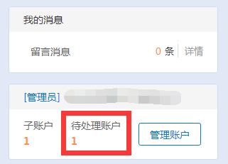 步驟一:登陸企業(yè)賬號并進入用戶中心,在右側(cè)會發(fā)現(xiàn)有“待處理賬戶”,點擊“管理賬戶”對其進行管理。