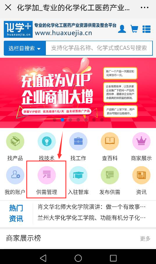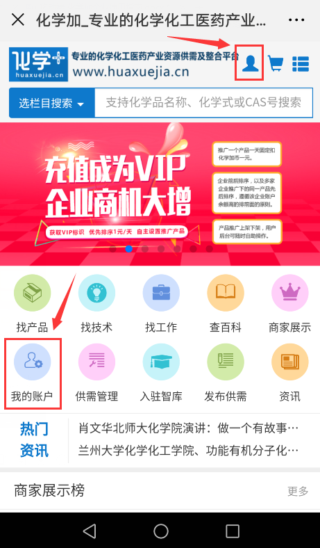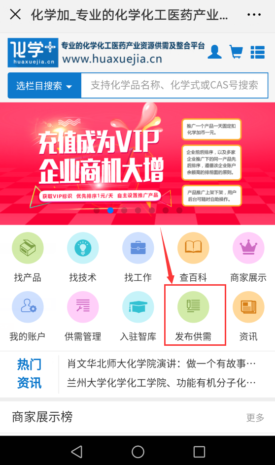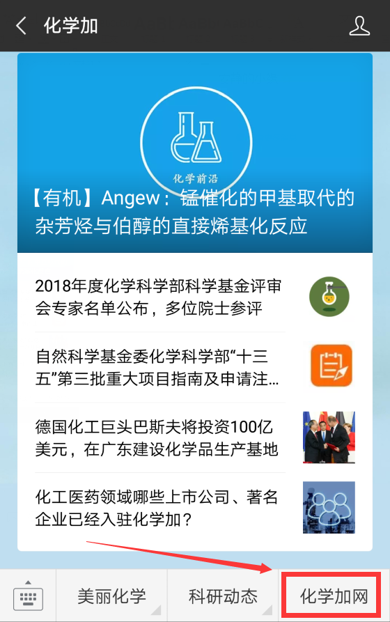 2.關(guān)注微信公眾號化學(xué)加,菜單欄右下角即有“化學(xué)加網(wǎng)”按鈕,點(diǎn)擊即可進(jìn)入。