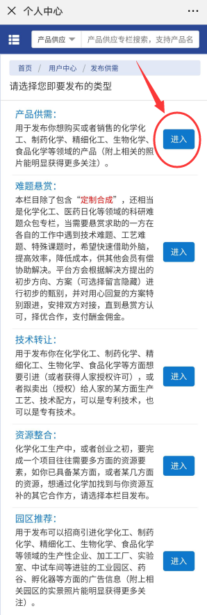 2.進(jìn)入發(fā)布供需的頁面之后,按照各個欄目的說明,發(fā)布自己所需要發(fā)布的信息。想發(fā)布產(chǎn)品就點(diǎn)擊產(chǎn)品供需的“進(jìn)入”按鈕。