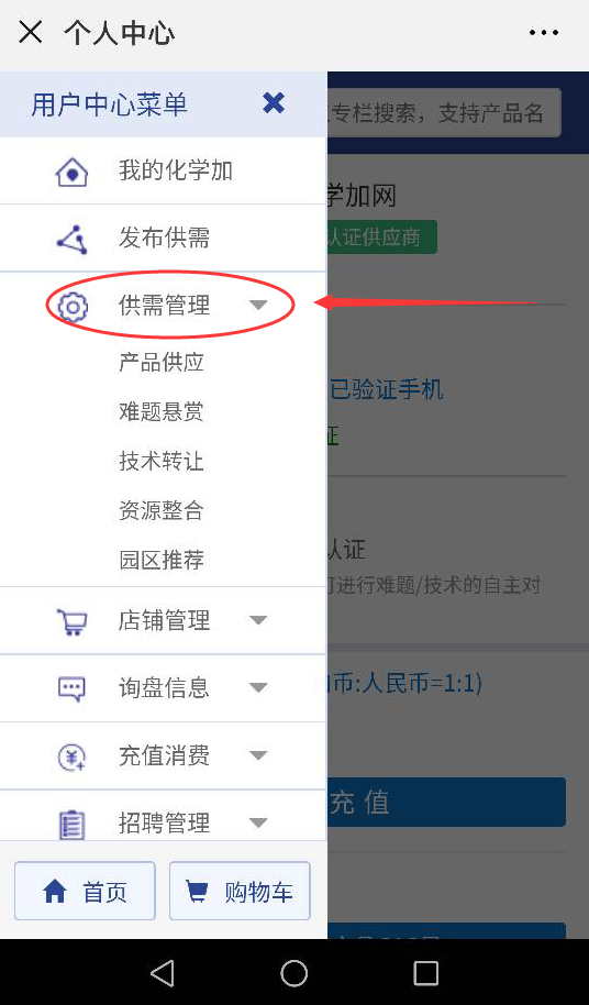 2.在個人中心頁面,點(diǎn)擊左上角的書柜按鈕,展開用戶中心菜單,點(diǎn)擊一下供需管理,再根據(jù)想查看的欄目點(diǎn)擊相應(yīng)欄目進(jìn)入。