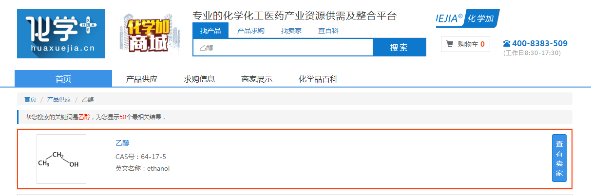 步驟一:登錄化學(xué)加網(wǎng)之后,在搜索欄“找產(chǎn)品”一項(xiàng),輸入您要尋找的產(chǎn)品中文名或者CAS號(hào),搜索結(jié)果出來后,點(diǎn)擊結(jié)果右側(cè)的“查看賣家”,如圖所示。