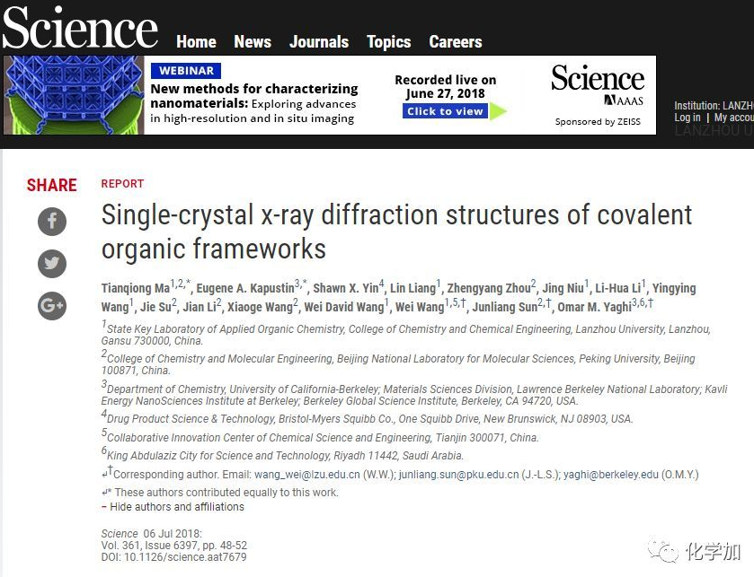 7月6日,美國《科學》雜志以“Single-crystal x-ray diffraction structures of covalent organic frameworks”為題,發(fā)表了蘭州大學...