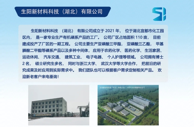 生陽新材料科(湖北)有限公司成立于 2021年, 位于湖北宜都市化工園區(qū)內(nèi), 是一家專業(yè)生產(chǎn)有機(jī)磷系產(chǎn)品的工廠。公司廠區(qū)占地面積 110 畝, 目前建成投產(chǎn)了廠區(qū)的一期工程。公司主要生產(chǎn)亞磷酸三甲酯,...