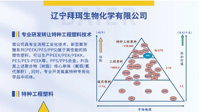 遼寧拜珥生物化學(xué)有限公司具有全流程工業(yè)化技術(shù),新型聚芳醚系列(PEEK/PES/PPS)屬于高性能的熱塑性塑料,可以生產(chǎn)PEEK/PEK/PEKK,PES/PES-PEEK等,PPS/PPS合金,PI...