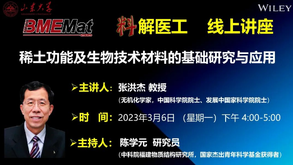BMEMat“料解醫(yī)工”系列講座第九期將于2023年3 月 6 日(星期一)下午4:00-5:00(北京時(shí)間)舉辦,特別榮幸邀請(qǐng)到無機(jī)化學(xué)家、中國(guó)科學(xué)院院士、發(fā)展中國(guó)家科學(xué)院院士張洪杰教授為我們作報(bào)告...
