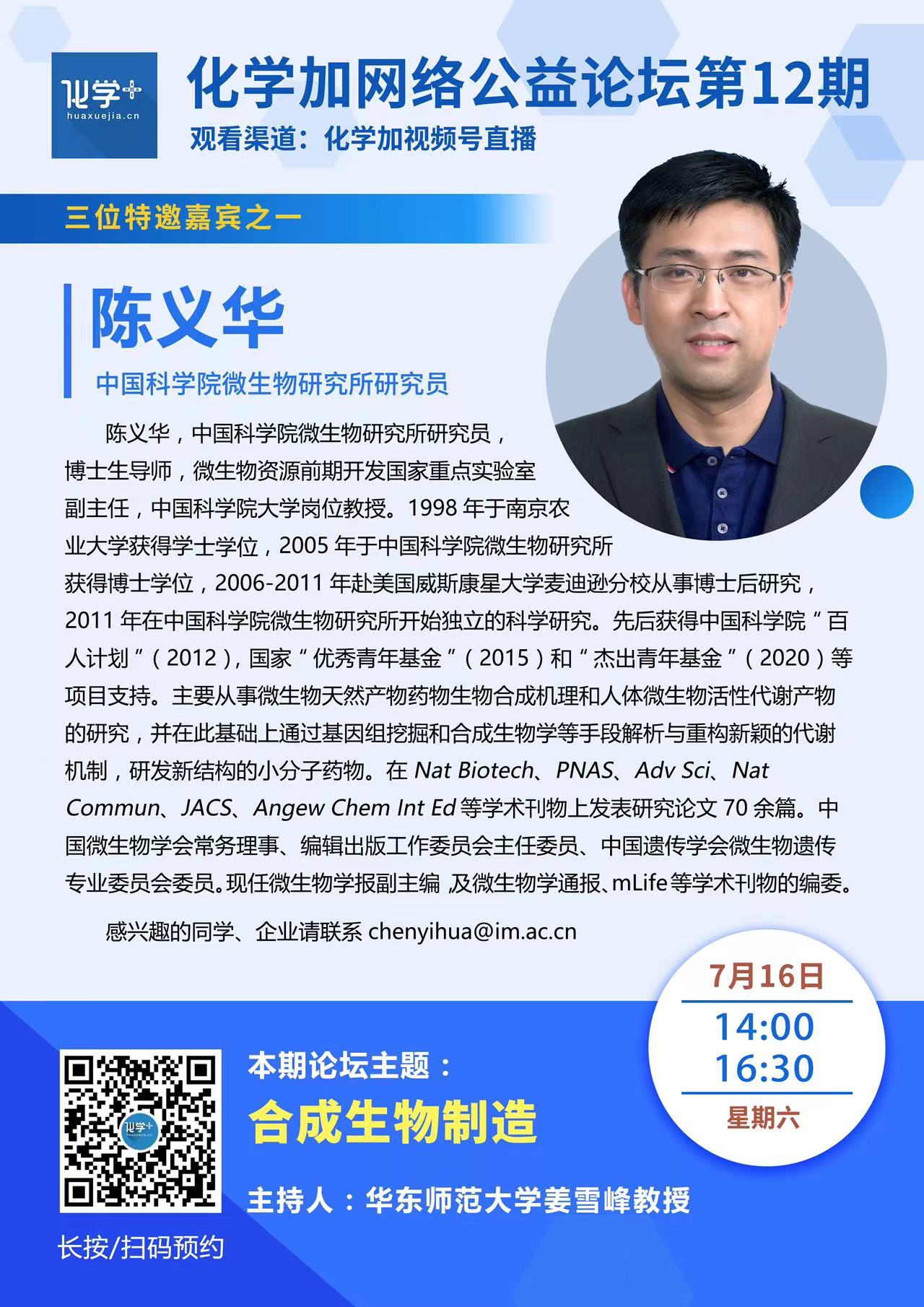 化學(xué)加網(wǎng)絡(luò)公益論壇第12期將于2022年7月16日(星期六)14:00-16:30舉行,我們很高興邀請到了中國科學(xué)院微生物研究所陳義華研究員、中國科學(xué)院深圳先進(jìn)技術(shù)研究院周佳海研究員、中國科學(xué)院深圳先...