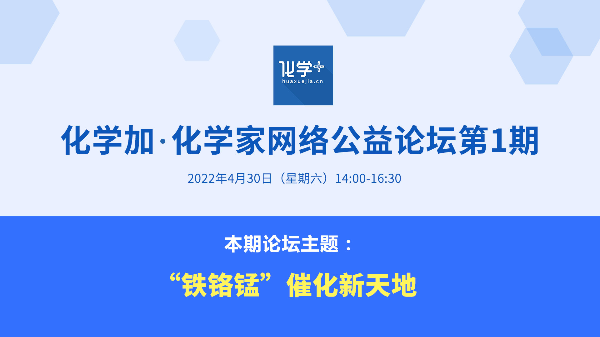 化學(xué)加-化學(xué)家網(wǎng)絡(luò)公益論壇第1期《“鐵鉻錳”催化新天地》將于4月30日下午2:00舉行,我們很高興邀請到四位優(yōu)秀的“國家杰青”化學(xué)家做客化學(xué)加平臺,共同探討“鐵鉻錳”催化新天地,以這樣的方式迎接今年的...