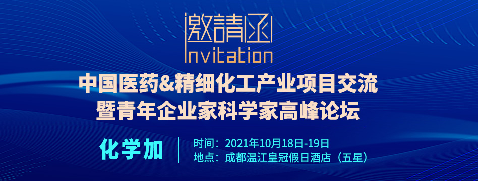 10月18-19日,化學(xué)加網(wǎng)將在四川成都舉辦“2021中國(guó)醫(yī)藥&精細(xì)化工產(chǎn)業(yè)項(xiàng)目交流暨青年企業(yè)家科學(xué)家高峰論壇”,歡迎醫(yī)藥精細(xì)化工產(chǎn)業(yè)相關(guān)從業(yè)者報(bào)名參會(huì)~...