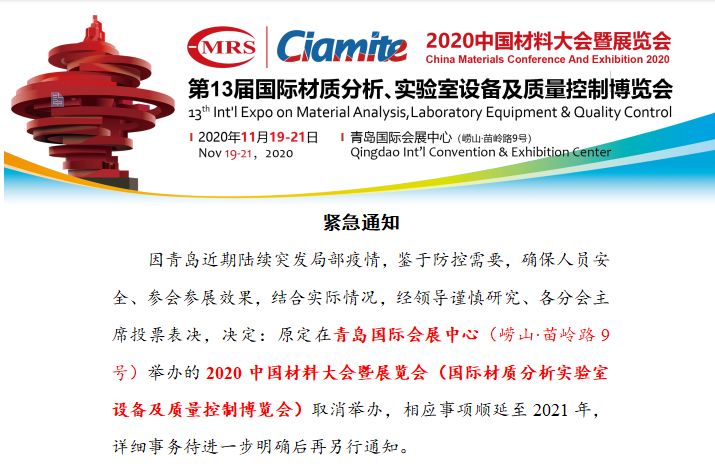 因青島近期陸續(xù)突發(fā)局部疫情,鑒于防控需要,確保人員安全、參會(huì)參展效果,結(jié)合實(shí)際情況,經(jīng)領(lǐng)導(dǎo)謹(jǐn)慎研究、各分會(huì)主席投票表決,決定:原定在青島國(guó)際會(huì)展中心(嶗山·苗嶺路9號(hào))舉辦的2020中國(guó)材料大會(huì)暨展覽...