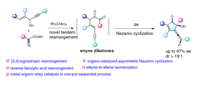 近日,常州大學(xué)孫江濤與唐生表課題組報道了一種涉及烯炔二酮的不對稱Nazarov環(huán)化反應(yīng),從而合成了一系列手性聯(lián)烯環(huán)戊烯酮衍生物,具有出色的非對映與對映選擇性以及良好的收率。機理研究表明,反應(yīng)涉及銠催化...