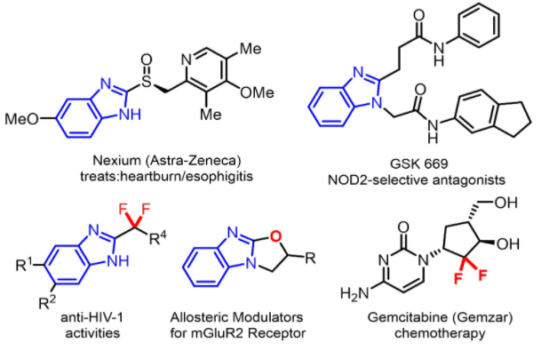 以苯并咪唑?yàn)楹诵墓羌艿幕衔飶V泛存在于諸多藥物分子中。研究表明,在苯并咪唑的C-2位置引入偕二氟取代烷基可以增強(qiáng)其藥理和生理活性。前期測(cè)試結(jié)果顯示,多氟取代烷基苯并咪唑?qū)Χ嗄夷I病的發(fā)生發(fā)展具有潛在的抑...