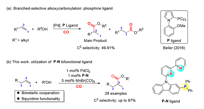 烷氧羰基化反應(yīng)是制備酯類(lèi)化合物的重要方法。通常,烷氧羰基化反應(yīng)是以過(guò)渡金屬為催化劑(如鈀配合物),以烯烴為原料、一氧化碳(CO)為羰源、醇為氫源和親核試劑反應(yīng)制備酯類(lèi)產(chǎn)物的過(guò)程,具有產(chǎn)物價(jià)值高、原子經(jīng)...