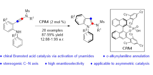廈門大學(xué)化學(xué)化工學(xué)院葉龍武教授課題組在基于炔酰胺的雜環(huán)合成方法學(xué)研究方面取得重要進(jìn)展,相關(guān)成果以“Synthesis of Axially Chiral N-Arylindoles via Atrop...