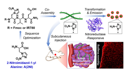 南開(kāi)大學(xué)化學(xué)學(xué)院余志林課題組報(bào)道了一種具有NTR-響應(yīng)的非經(jīng)典氨基酸,可在腫瘤乏氧區(qū)域基于硝基還原有效調(diào)控多肽組裝,同時(shí)開(kāi)啟納米結(jié)構(gòu)熒光特性,實(shí)現(xiàn)實(shí)體瘤乏氧區(qū)域的熒光成像檢測(cè)。該成果發(fā)表于J. Am....