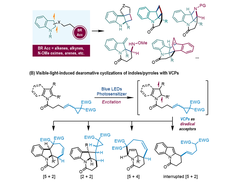 中科院上海有機(jī)所金屬有機(jī)化學(xué)國(guó)家重點(diǎn)實(shí)驗(yàn)室游書力研究員團(tuán)隊(duì)一直致力于發(fā)展可見(jiàn)光介導(dǎo)的去芳構(gòu)化反應(yīng)。近期,該團(tuán)隊(duì)發(fā)展了可見(jiàn)光的條件下激發(fā)態(tài)吲哚/吡咯與乙烯基環(huán)丙烷(VCP)的去芳構(gòu)化環(huán)加成反應(yīng)(J. A...