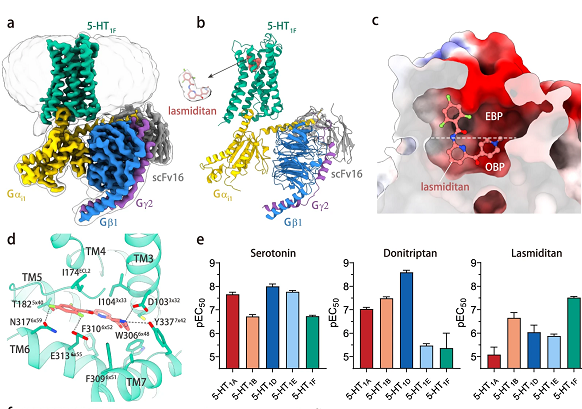 近日,中國科學院上海藥物研究所徐華強課題組利用冷凍電鏡技術,首次解析了5-HT1F受體結合G蛋白以及抗偏頭痛藥物拉米替坦的復合物結構,揭示了拉米替坦選擇性結合5-HT1F受體的結構基礎。...
