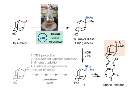 北京大學朱戎研究員團隊報道了依次經(jīng)歷氫原子轉(zhuǎn)移/氧化劑捕獲自由基過程的非活化烯烴與溶劑用量或試劑用量的腈類化合物發(fā)生氧化加氫酰胺化反應,能以高區(qū)域選擇性得到一系列α-叔酰胺類衍生物。該策略將CoSal...