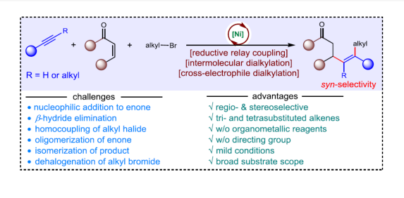 由于競(jìng)爭(zhēng)性的β-氫消除和選擇性問(wèn)題,直接合成具有多個(gè)脂肪族取代烯烴(具有區(qū)域和立體選擇性)一直是具有挑戰(zhàn)的課題。近日,南方科技大學(xué)舒?zhèn)フn題組在Nat. Commun.上發(fā)表論文,報(bào)道了鎳催化炔烴的分子...