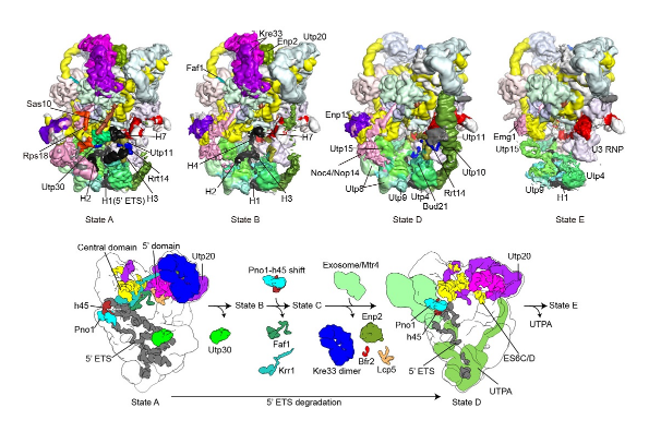 中國科學院生物物理研究所葉克窮課題組利用單顆粒冷凍電鏡技術(shù)解析了酵母核糖體小亞基早期前體向晚期前體轉(zhuǎn)化過程中的一系列過渡狀態(tài)的結(jié)構(gòu),首次觀察到該轉(zhuǎn)化的動態(tài)分子過程。該成果"Cryo-EM ...