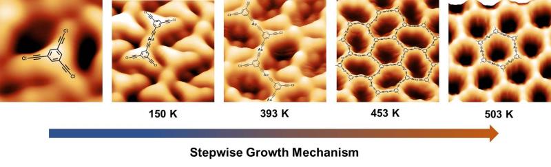 華東理工大學劉培念課題組設計了C3對稱的苯基炔氯前驅(qū)體分子,通過多個C-Cl鍵的可控逐步脫除反應,在原子尺度實現(xiàn)了炔-金屬二維MOFs的分步生長過程監(jiān)測,闡明了二維MOFs形成的逐步反應機理。...