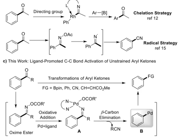 普通芳香酮的碳碳鍵活化一直以來都充滿著挑戰(zhàn)。最近,中科院上海藥物所的戴輝雄課題組在國際著名期刊Angew上報道了在雙配體輔助下、鈀催化芳香酮的碳碳鍵的交叉偶聯(lián)反應(yīng),文章DOI: 10.1002/ani...