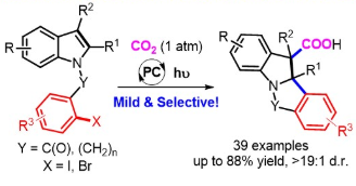 四川大學(xué)余達(dá)剛課題組實現(xiàn)可見光催化CO2參與的吲哚還原去芳構(gòu)化-羧基化反應(yīng),該研究成果發(fā)表在《Nature Communications》上,題目為“Reductive Dearomative Ary...
