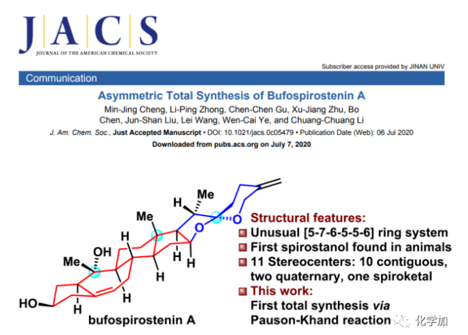 近日,南方科技大學(xué)李闖創(chuàng)教授團隊與暨南大學(xué)葉文才教授團隊等合作,以獨特的Pauson–Khand反應(yīng)為關(guān)鍵策略,完成了復(fù)雜活性甾體Bufospirostenin A的首次不對稱全合成,相關(guān)成果以“As...