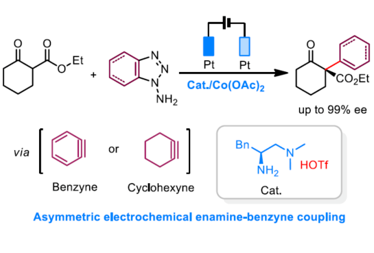 由于苯炔是高反應(yīng)活性和非極性的中間體,基于苯炔中間體的不對稱催化是挑戰(zhàn)性難題。近日,清華大學(xué)羅三中教授課題組在Angew發(fā)表論文,報(bào)道了一種電化學(xué)氧化生成苯炔和環(huán)己炔中間體的方法,并成功與手性伯胺催化...