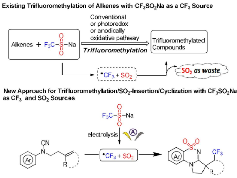 吉林大學(xué)化學(xué)學(xué)院的寮渭巍教授課題組Langlois試劑作為雙功能試劑:電化學(xué)三氟甲基化/SO2插入/串聯(lián)環(huán)化合成三氟甲基取代的磺內(nèi)酰亞胺衍生物