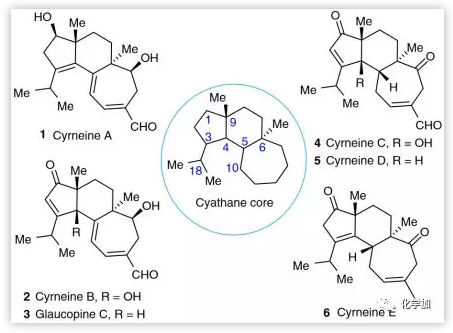 Cyrneines A?E和glaucopine C是一類新型的cyathane二萜亞科,其具有相同的5-6-7稠合三環(huán)核心骨架,且環(huán)連接處擁有兩個(gè)季碳手性中心(Figure 1)。由于它們較高的氧化...