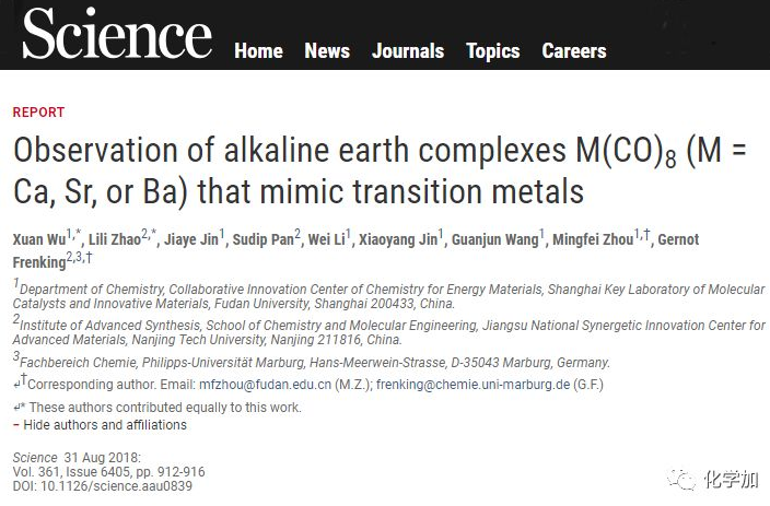 近日,復(fù)旦大學(xué)化學(xué)系教授周鳴飛課題組實(shí)驗(yàn)發(fā)現(xiàn)主族的堿土金屬元素鈣、鍶和鋇可以形成穩(wěn)定的八羰基化合物分子,滿足18電子規(guī)則,表現(xiàn)出了典型的過(guò)渡金屬成鍵特性。該發(fā)現(xiàn)表明堿土金屬元素或具有與一般認(rèn)知相比更為...