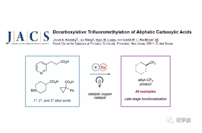 在分子結(jié)構(gòu)中引入三氟甲基可以有效地改變分子的代謝穩(wěn)定性、膜滲透性。最近,普林斯頓大學(xué)的MacMillan教授報(bào)道了第一例Cu和光協(xié)同催化的烷基羧酸的三氟甲基化反應(yīng),文章DOI: 10.1021/jac...