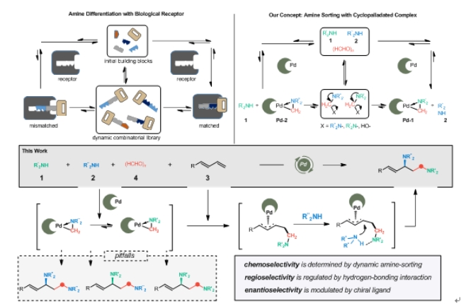 近日,中國科學技術(shù)大學黃漢民教授課題組發(fā)展了一種新型的烷基胺動態(tài)排序策略,開拓性地將其長期深耕的氮雜三元環(huán)鈀絡(luò)合物—Huang-Complex作為胺的識別工具,實現(xiàn)了對具有相似結(jié)構(gòu)和性質(zhì)的胺同系物的精...