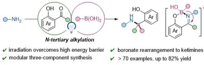 α-叔胺作為藥物分子和生物活性分子的重要骨架,其合成一直是合成化學研究的熱點。傳統(tǒng)的N-叔烷基化反應(yīng)往往受到底物空間位阻大、反應(yīng)活化能壘高等因素的限制。為了解決這些問題,中國科學院上海有機化學研究所陳...