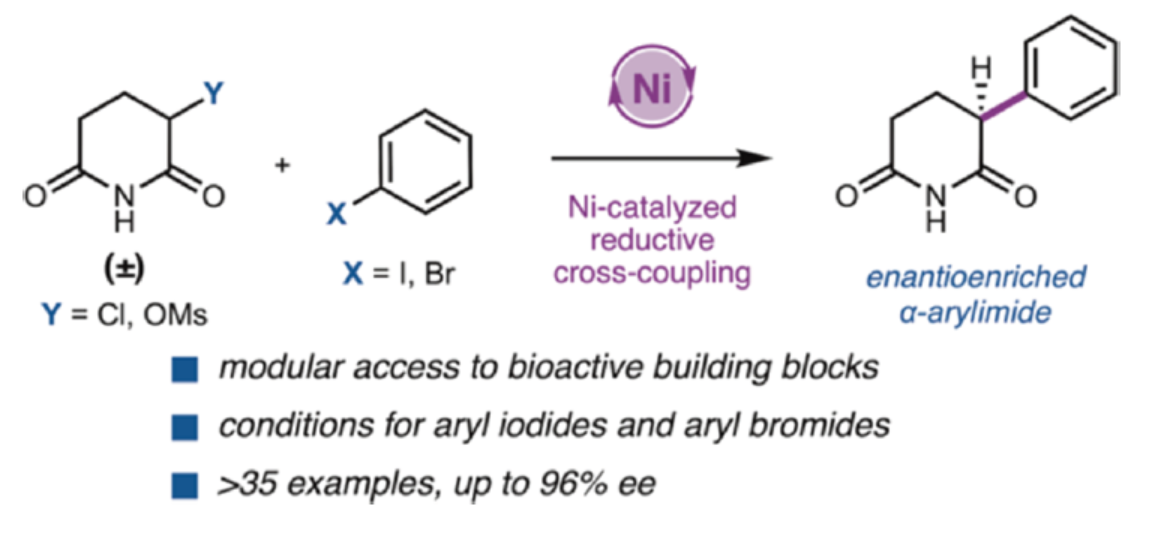 近日,美國加州理工學院Sarah E. Reisman課題組報道了一種鎳催化酰亞胺(imide)親電試劑和(雜)芳基鹵化物的不對稱還原交叉偶聯(lián)反應(yīng),從簡單的起始原料合成了一系列對映富集的α-芳基戊二酰...