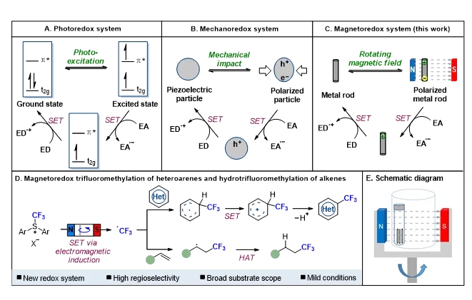 近期,山東理工大學(xué)李新進(jìn)課題組設(shè)計了一種電磁感應(yīng)促進(jìn)的有機(jī)分子的氧化還原反應(yīng)。該研究的設(shè)計思路是在旋轉(zhuǎn)磁場中金屬導(dǎo)體通過切割磁感線產(chǎn)生感應(yīng)電動勢,通過調(diào)控磁場強(qiáng)度、金屬導(dǎo)體長度以及旋轉(zhuǎn)頻率實現(xiàn)與反應(yīng)物...