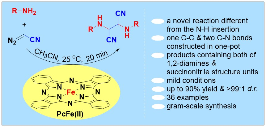 近日,宜春學(xué)院鄒懷波課題組報(bào)道了一種酞菁鐵(Ⅱ)(PcFe(II))催化下重氮乙腈與一級(jí)胺之間進(jìn)行的自二聚-串聯(lián)二胺化反應(yīng)。據(jù)目前所知,傳統(tǒng)意義上,金屬催化下重氮試劑與胺的反應(yīng)是進(jìn)行N-H鍵插入,生成...