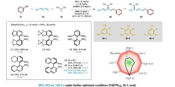 近期,中國科學(xué)技術(shù)大學(xué)龔流柱、韓志勇團(tuán)隊報道了光照條件下鈀催化烷烴等參與的1,3-二烯的不對稱烷胺化反應(yīng),使用手性鈀作為催化劑,芳基溴作為間接HAT試劑,從含有碳(sp3)?氫鍵的化合物出發(fā)合成手性烯...